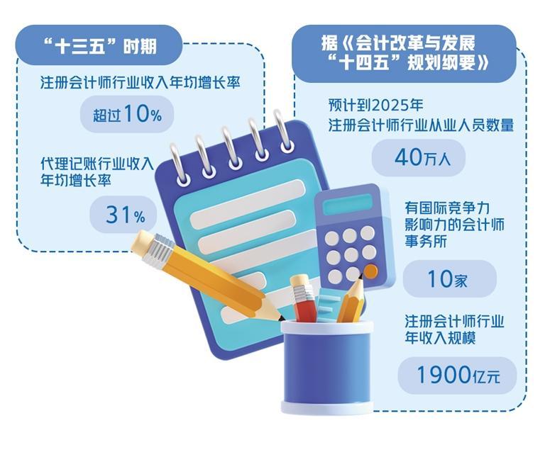 近年来,会计服务市场更加繁荣。据统计,“十三五”时期,注册会计师行业收入年均增长率超过10%,代理记账行业收入年均增长率达到31%,会计服务的市场活力充分激发。据《会计改革与发展“十四五”规划纲要》,到2025年,注册会计师行业从业人员数量预期达40万人,注册会计师行业年收入规模预期达1900亿元。会计行业的转型升级已具有较好的发展基础和人才保障。
