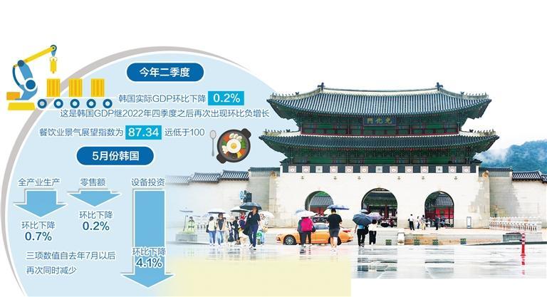 尽管上半年韩国出口持续改善,但民间消费和企业投资出现萎缩,其对整体经济增长造成的冲击远超政府预期。韩国银行7月25日公布的初步核算数据显示,韩国今年二季度实际国内生产总值(GDP)环比下降0.2%。这是韩国GDP继2022年四季度之后再次出现环比负增长。尽管出口强劲,但国内需求疲软给复苏前景蒙上了阴影。