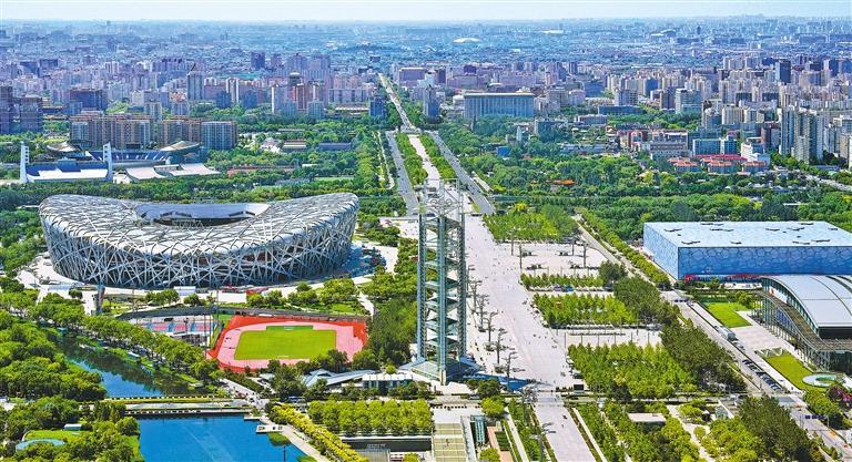 从奥林匹克塔拍摄的北京中轴线上的部分建筑群和中轴线延伸线上的“鸟巢”“水立方”等。7月27日,在印度新德里召开的联合国教科文组织第46届世界遗产大会通过决议,将“北京中轴线——中国理想都城秩序的杰作”列入《世界遗产名录》。
