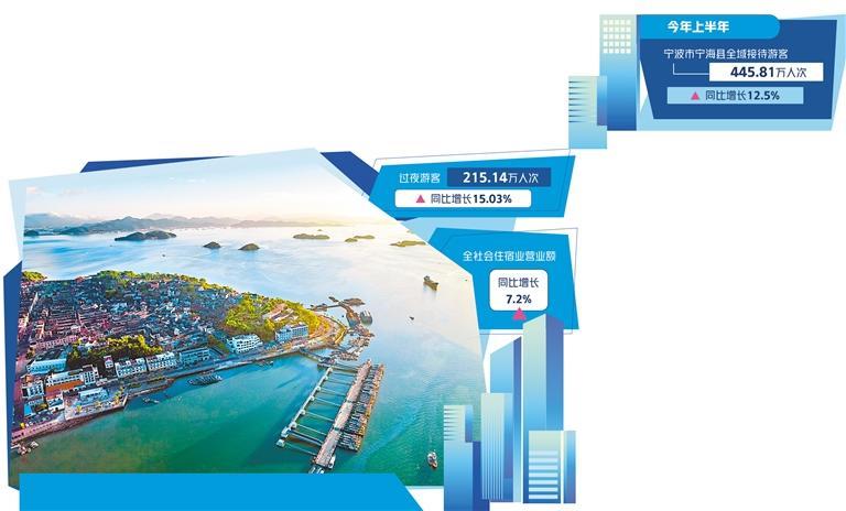 一业兴,百业旺。旅游业是串起一二三产业的综合性产业。宁海县积极搭建旅游市场消费体系,积极实施“烟火缑城”工程,聚焦本土住宿业发展,打响“缑乡百宿”文旅消费品牌。立足“内提升、深推广、外惠民”,促消费政策发力显效,开展线上线下文旅消费活动,通过“云闪付”、携程、蜗牛游等平台,设置旅游线路、景区、住宿、旅行社等5类文旅专项消费体验,全面拉动旅游消费。今年上半年,宁海县全域接待游客445.81万人次,同比增长12.5%,过夜游客215.14万人次,同比增长15.03%;限上(指年营收在200万元以上的企业)住宿业营业额同比增长6.4%,全社会住宿业营业额同比增长7.2%。
