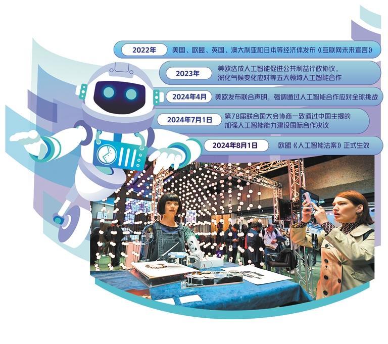 尽管西方国家人工智能治理路径有所不同,但正通过对话加强规则沟通和政策协调。2022年,美国、欧盟、英国、澳大利亚和日本等经济体发布《互联网未来宣言》。2023年,美欧达成人工智能促进公共利益行政协议,深化气候变化应对等五大领域的人工智能合作。2023年,七国集团达成《人工智能国际指导原则》和《人工智能开发者自愿行为准则》。2024年4月,美欧发布联合声明,强调通过人工智能合作应对全球挑战,美英还宣布达成人工智能安全科学合作伙伴关系。