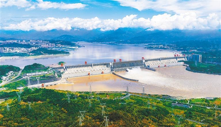 7月30日,在湖北宜昌拍摄的三峡电站外送输电线路。随着由乌东德、白鹤滩、溪洛渡、向家坝、三峡、葛洲坝6座梯级水电站构成的世界最大清洁能源走廊110台机组全开运行,截至7月23日,2024年梯级水电站单日发电量超10亿千瓦时天数达35天,最高单日发电量达15亿千瓦时,全力协助电网迎峰度夏。