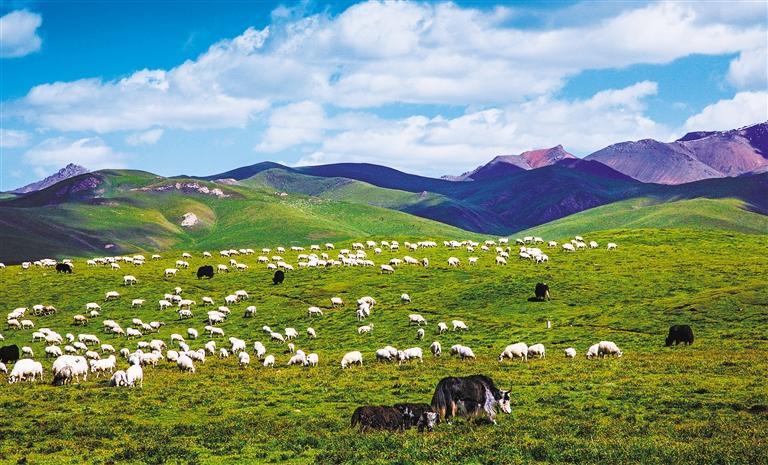 7月3日,青海湖畔草原景色秀美,牛羊成群。随着环境保护的持续推进,当地生态正在逐年改善。