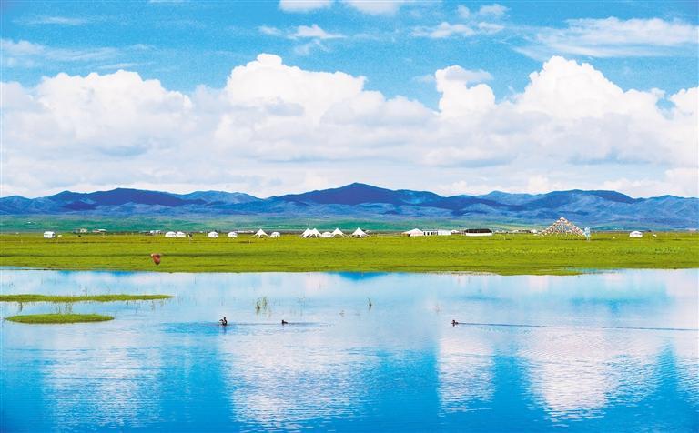 7月19日,盛夏的甘肃省甘南藏族自治州玛曲县河曲马场景区绿草如茵,山清水秀,引人入胜。