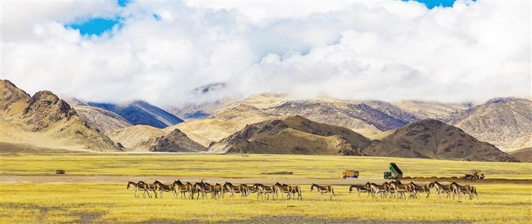 6月30日,西藏革吉县境内阿里公路日盐段施工现场,建设者们抢抓工期,推进工程加快建设。