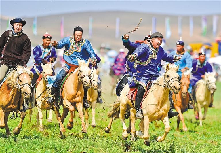 7月14日,牧民马队在内蒙古锡林郭勒盟锡林浩特市举行的第34届草原那达慕开幕式上表演,让游客沉浸式感受草原魅力。 王 正摄(中经视觉)