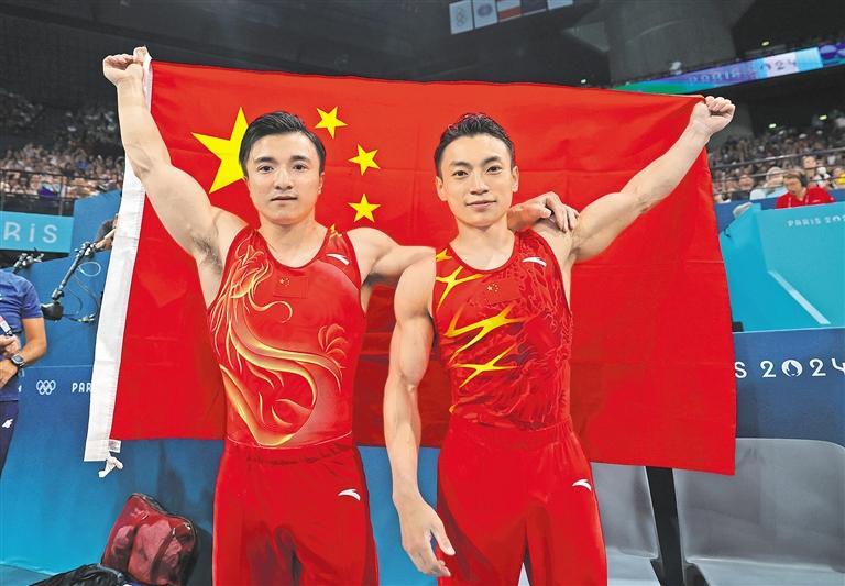 8月4日,在巴黎奥运会体操男子吊环决赛中,中国选手刘洋获得冠军,邹敬园获得亚军,希腊选手佩德罗尼亚斯获得季军。这是中国选手刘洋(左)、邹敬园在赛后庆祝。