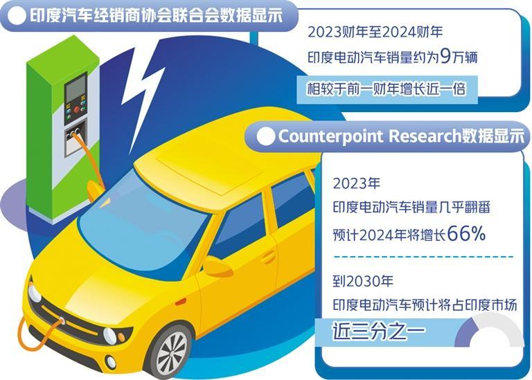 近年来,印度电动汽车市场呈现出较快增长趋势。印度汽车经销商协会联合会发布的数据显示,2023财年至2024财年(2023年4月1日至2024年3月31日),印度电动汽车销量约为9万辆,相较于前一财年增长了近一倍。另外,研究公司Counterpoint Research数据显示,2023年印度电动汽车销量几乎翻番,预计2024年将增长66%,达到乘用车总销量的4%。到2030年,印度电动汽车预计将占印度市场的近三分之一。