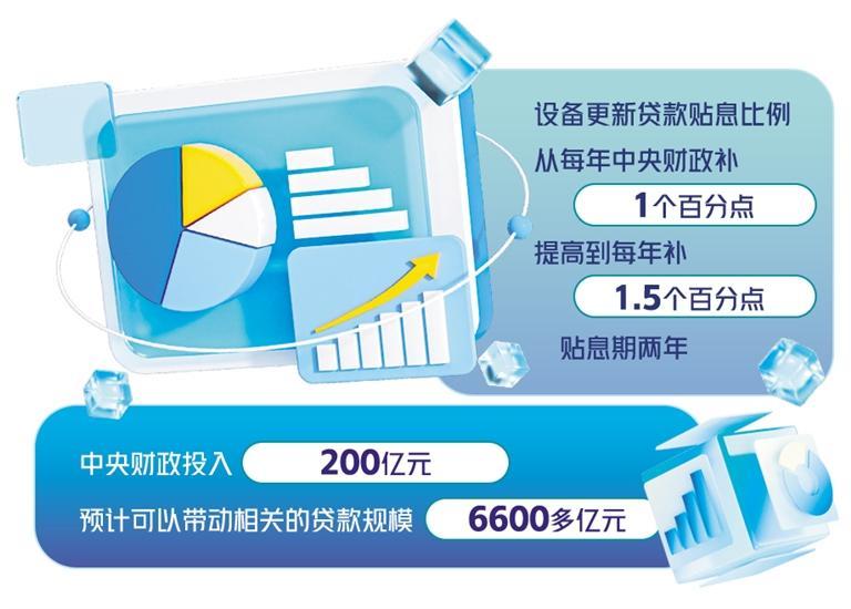 贷款贴息方面,设备更新贷款贴息比例从每年中央财政补1个百分点,提高到每年补1.5个百分点,贴息期两年,中央财政投入200亿元,“真金白银”支持经营主体进行设备更新和技术改造,预计可以带动相关的贷款规模6600多亿元。