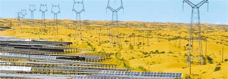 8月5日,位于宁夏中卫腾格里沙漠的光伏基地。宁夏腾格里沙漠新能源基地项目采取“光伏+生态”方式,形成板上发电、板下治沙的发展模式,助力构建清洁低碳、安全高效的能源体系。
