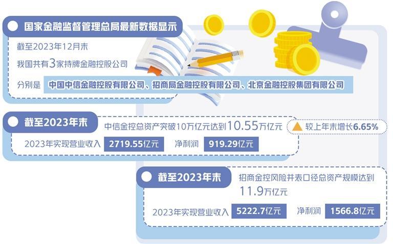 作为对产业资本、金融资本实行制度性隔离的有效手段,组建金融控股公司的相关工作正在稳步推进。国家金融监督管理总局最新数据显示,截至2023年12月末,我国共有3家持牌金融控股公司,分别是中国中信金融控股有限公司、招商局金融控股有限公司、北京金融控股集团有限公司。