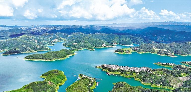 8月7日拍摄的贵州省兴义市万峰湖。万峰湖湖面约176平方公里,覆盖了黔桂滇三省(区)的五县(市),既是沿湖地区的水上黄金运输线,也是重要生态屏障。