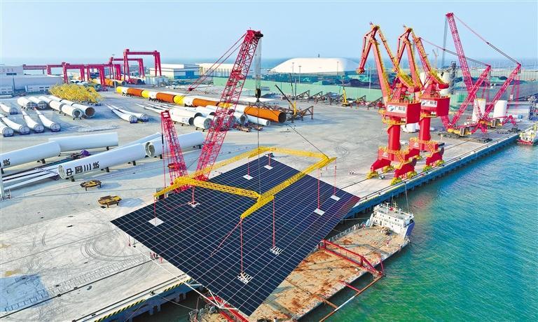 8月8日,山东省东营经济技术开发区广利港风电码头,海上光伏平台顺利完成装船作业,将运往东营国华HG14海上光伏项目施工区域。