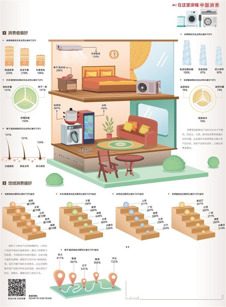 数据显示,电蒸锅、内衣/裤清洗机、离子/直发梳的成交额同比增长均超2倍。同时,受炎热天气的影响,冰吧、空调套装这类消暑家电的销售热度也显著提升,成交额同比均翻番增长。
