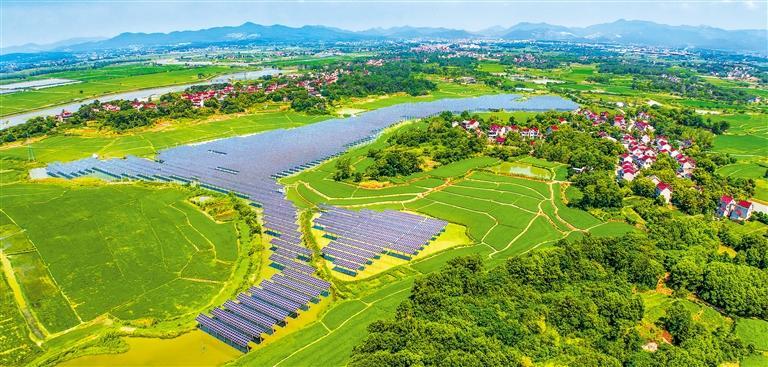 8月9日,俯瞰位于安徽省铜陵市枞阳县汤沟镇的湴湖光伏电站。近年来,当地依托长江沿线资源禀赋,有序推进水面光伏电站等生态清洁能源项目建设,推动能源转型,助力乡村绿色发展。郜小兵摄(中经视觉)