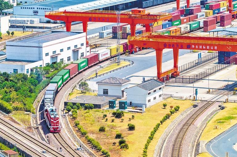八月十日,首趟满载一百标准箱货物的列车从浙江金华南货场启程,标志着甬金铁路“金华—宁波舟山港穿山港区”海铁联运直达班列通道正式启用。杨梅清摄(中经视觉)