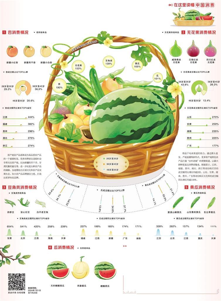 从消费人群上看,购买杏、豆角、黄瓜的消费者中,36岁至45岁是主力人群;购买无花果和瓜类产品的消费者中,26岁至35岁的人群占比最大。从地域消费来看,江西、福建、北京、天津、湖南的消费者对购买时令蔬果的热情最高。
