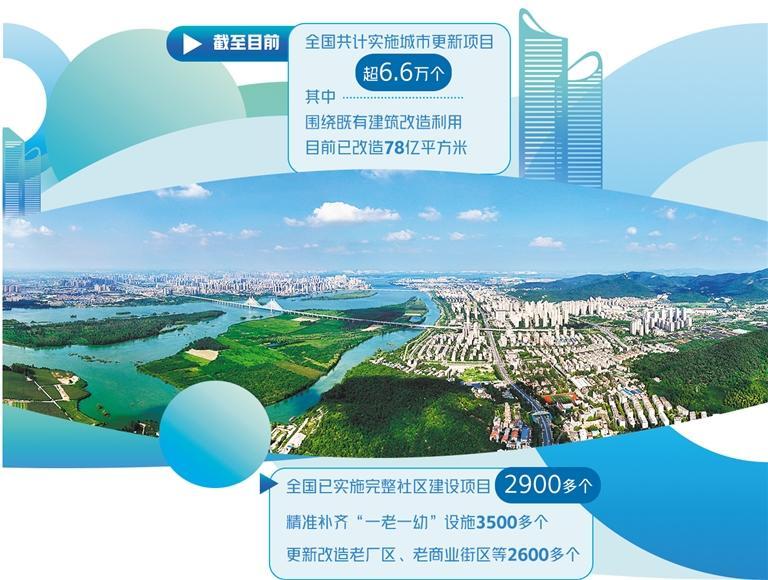 住房和城乡建设部有关负责人介绍,6.6万多个已实施的城市更新项目中,围绕既有建筑改造利用,目前已改造78亿平方米。全国已实施完整社区建设项目2900多个,精准补齐“一老一幼”设施3500多个,更新改造老厂区、老商业街区等2600多个,建设和改造医疗、体育、教育、文化设施近1.5万个,改造城市燃气等各类管道约10万公里,修复城市破损山体4.97万平方米,新建和改造城市绿地3.4万公顷。