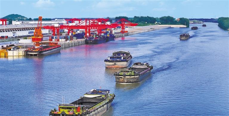 8月13日拍摄的京杭大运河江苏徐州双楼港口国际集装箱码头。船只往来穿梭,运输建材等生产生活物资。高 刚摄(中经视觉)