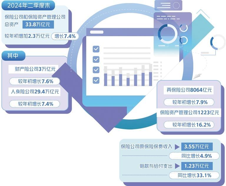数据显示,2024年二季度末,保险公司和保险资产管理公司总资产33.8万亿元,较年初增加2.3万亿元,增长7.4%;其中,保险资产管理公司1223亿元,较年初增长16.2%。保险公司原保险保费收入3.55万亿元,同比增长4.9%;赔款与给付支出1.23万亿元,同比增长33.1%;新增保单件数472亿件,同比增长40%。