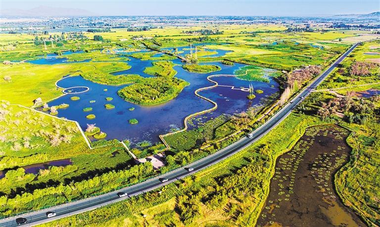 8月11日,甘肃省张掖市甘州区三闸镇二闸村,穿村公路与湖光山色相映成趣。近年来,当地推进“四好农村路”建设,以路兴乡村、以路旺产业,有力推动了宜居宜游和美乡村建设。杨永伟摄(中经视觉)