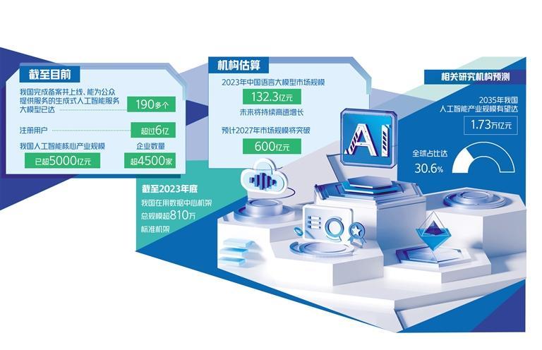 超大的市场规模、海量的应用场景,是我国发展人工智能的优势。据统计,2023年,深圳市人工智能产业规模同比增长超过20%,人工智能企业数量同比增长近20%,形成华为、腾讯等头部企业引领,元象科技、思谋科技、兔展智能和深信服等高成长性企业支撑,一大批初创企业协同发展的良好格局。2023年,北京市人工智能产业核心产值突破2500亿元。目前北京已备案上线大模型82款,占全国比重超四成。北京市经济信息中心研究部主任杨永恒表示,目前,北京市已在人工智能产业形成全面优势,智源研究院、百度、智谱华章、生数科技等已迭代发布人工智能大模型产品。