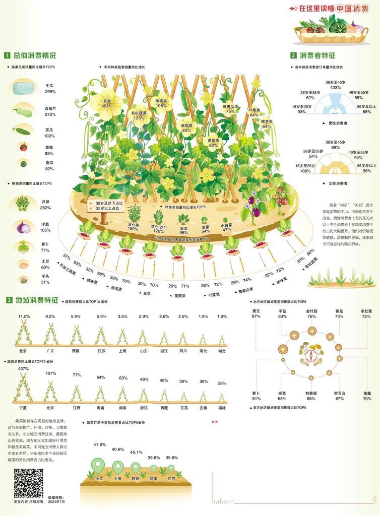 过去一年,蔬菜消费订单中男性消费者占比由33%提高到超过40%。其中,36岁至45岁的男性消费者蔬菜购买订单量同比增速达到423%,远超其他年龄段消费者。浙江、上海、陕西等省份的蔬菜订单中,男性消费者占比靠前。