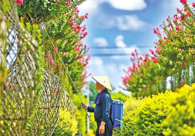 8月14日,江苏省盐城市射阳县,在江苏农垦新洋农场容器苗项目基地,管理人员正在为紫薇花瓶喷施药物防病治虫。据悉,新洋农场建成配有水肥一体、智能控制等设备的容器苗圃200亩。张伟生摄(中经视觉)