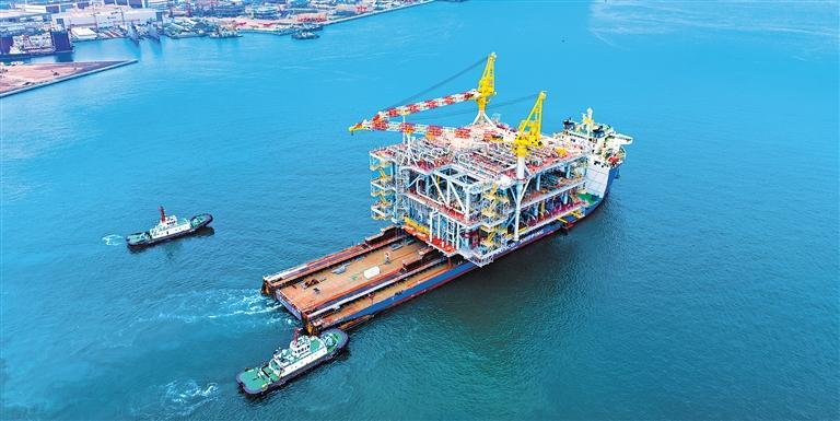 8月16日,半潜船“祥和口”轮装载着中国目前建造重量最大的国际海洋石油平台——马赞油气集输平台,从青岛海西湾起航开往沙特阿拉伯海域。该平台主要负责将开采出的海洋油气汇集并输送到陆地进行处理,每年可汇集输送原油2400万吨,伴生气74亿立方米。杨雪梅摄(中经视觉)