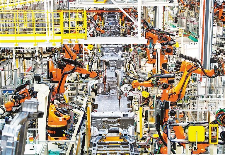8月17日,位于山东莱西的北京汽车制造厂青岛总部基地生产车间,机械手在进行新能源汽车焊接作业。近年来,莱西市重点打造新能源汽车产业链,初步形成以整车制造为主导、关键零部件联动发展的产业体系。张进刚摄(中经视觉)