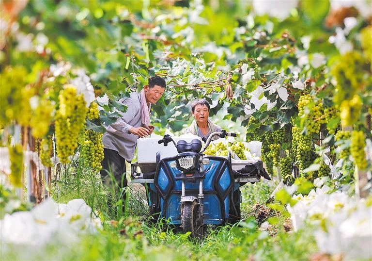 8月18日,江苏宿迁泗洪县界集镇农民在“三岗”联合党委葡萄园采摘葡萄。近年来,当地在区域分布较近、资源禀赋相似、发展类型趋同的90个村(社区)中组建25个联合党委,按照“党委+合作社+农户”经营模式,盘活资产、资源、资金,打造一批特色农业产业集群。