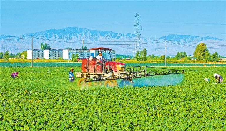 8月18日,甘肃省张掖市甘州区乌江镇贾家寨村蔬菜种植基地,菜农驾驶高杆喷药机进行蔬菜防虫作业,为秋菜丰产丰收打好基础。 杨 潇摄(中经视觉)