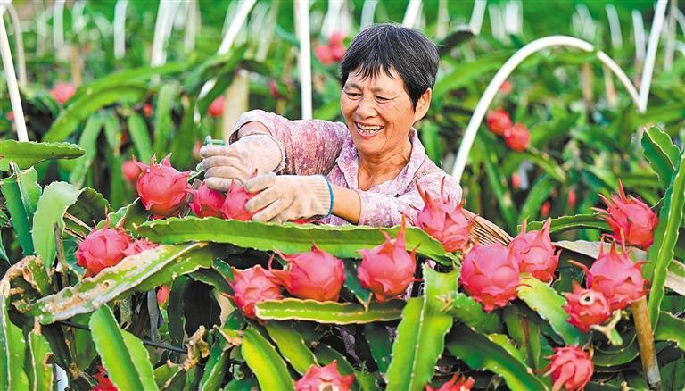 ▶8月7日,四川省仁寿县怀仁街道吊庆社区种植的红心火龙果喜获丰收。