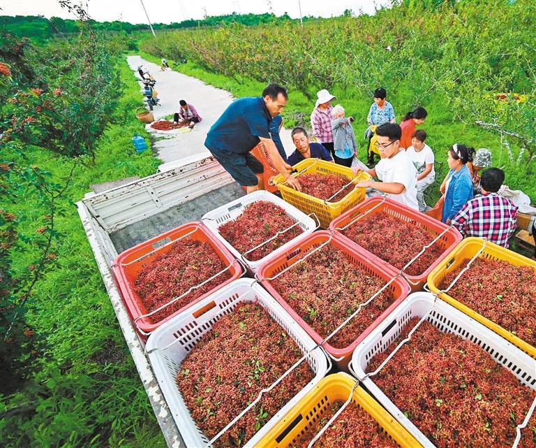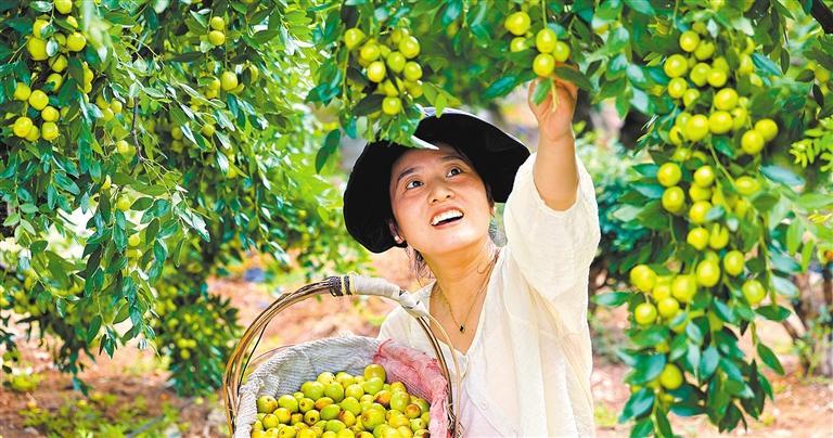 ◀8月18日,安徽省淮北市宋疃镇黄营村万亩山地灵枣树进入成熟期,吸引众多游客前来采摘。