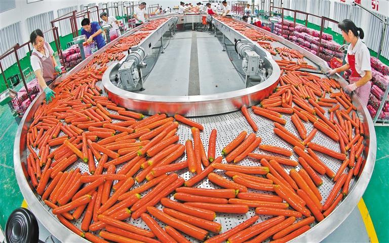 ▶8月8日,陕西省大荔县朝邑镇荔盛萝卜专业合作社的员工在分选沙苑红萝卜,供应国内外市场。