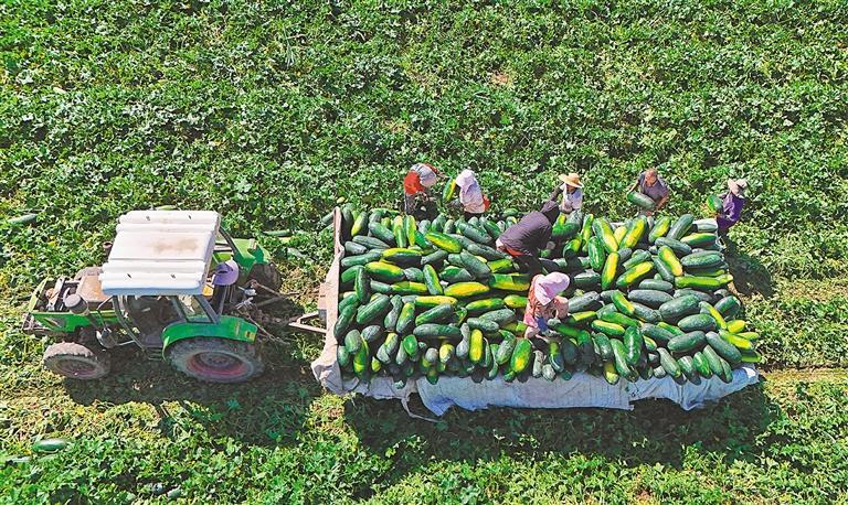 ▼8月9日,新疆维吾尔自治区呼图壁县园户村镇十三户村冬瓜种植基地,农民在田间忙着采收装车。