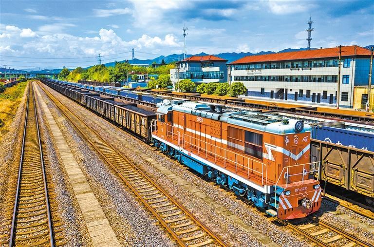 8月20日,浙江省金华市铁路功塘货运场内,满载煤炭等重点物资的列车在轨道上有序运行。进入8月以来,浙江省大范围持续高温,企业和居民用电需求不断攀升,区域内电厂发电量创历史同期新高。为此,铁路金华车务段全力加强电煤重点物资运输,保障管辖区域内供电企业用煤需求。胡肖飞摄(中经视觉)
