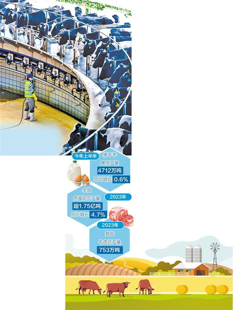 农业农村部信息显示,2023年,畜牧业生产全面增长,肉蛋奶消费需求得到有效保障。全国肉蛋奶总产量超过1.75亿吨,同比增长4.7%,再创历史新高。畜牧业产业素质持续提升,规模化、标准化、集约化发展深入推进。畜产品质量安全保持较好水平,粪污资源化、兽药减量化成效显著。国家统计局数据显示,今年上半年,猪牛羊禽肉产量4712万吨,同比增长0.6%,其中,牛肉、禽肉、牛奶、禽蛋均实现增长。