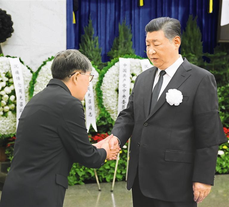 上午9时30分许,习近平、赵乐际、王沪宁、蔡奇、丁薛祥、李希、韩正等,在哀乐声中缓步来到周光召同志的遗体前肃立默哀,向周光召同志的遗体三鞠躬,并与周光召同志亲属一一握手,表示慰问。
