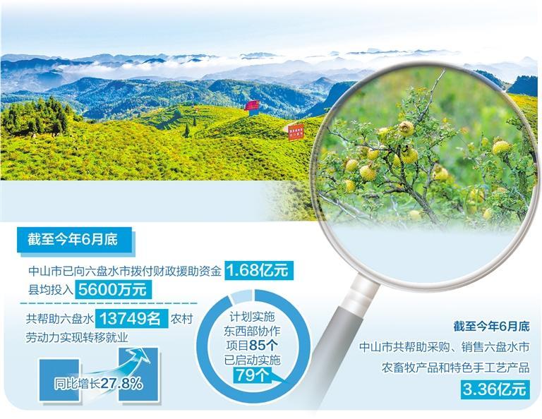 自协作关系建立以来,中山、六盘水发挥各自优势,在产业、劳务、教育、医疗、文旅消费等领域开展了一系列务实高效的合作,越来越多来自粤港澳大湾区的资金、技术、人才等不断涌入六盘水。据统计,截至今年6月底,中山市已向六盘水市拨付财政援助资金1.68亿元,县均投入5600万元;计划实施东西部协作项目85个,已启动实施79个,共帮助六盘水13749名农村劳动力实现转移就业,与去年同期相比增长27.8%。