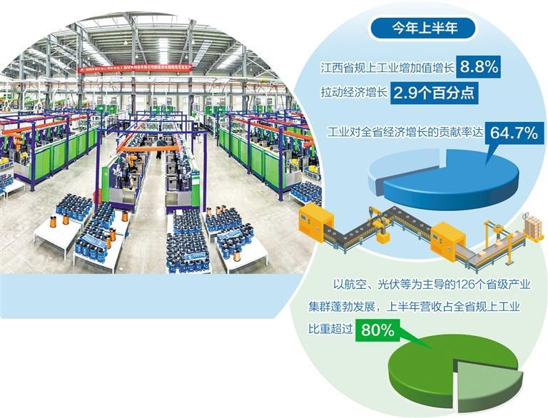 今年以来,江西省大力实施“1269”行动计划,加快挺起产业脊梁,电子信息、有色金属、装备制造等重点产业链现代化建设取得明显成效,以航空、光伏等为主导的126个省级产业集群蓬勃发展,上半年营收占全省规上工业比重超过80%,有力支撑全省工业经济运行持续回升、稳步向好。数据显示,今年上半年,江西省规上工业增加值增长8.8%,居全国第四位、中部第一位,工业对全省经济增长的贡献率达64.7%,拉动经济增长2.9个百分点;其中高技术制造业、装备制造业增加值同比分别增长20.2%、17.2%。