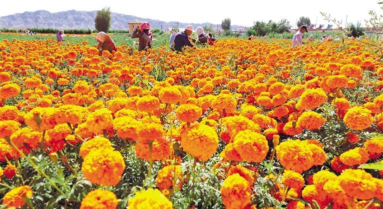 8月21日,甘肃省张掖市山丹县清泉镇双桥村如意花海万寿菊种植基地内,花农们正在采摘万寿菊。当地推动“农业种植+文化旅游”融合发展,种植的百万株万寿菊不仅成为促进农户增收的特色产业,更成为乡村旅游新亮点。 王 将摄(中经视觉)