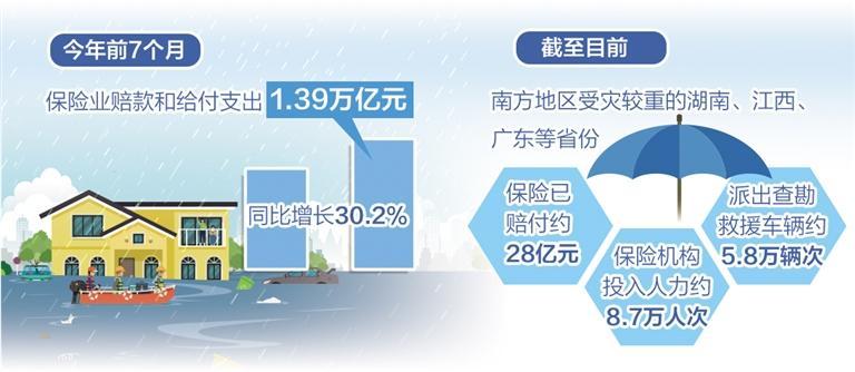 进入汛期以来,全国多地遭遇暴雨、台风等极端天气,引发的洪水、山体滑坡等次生灾害严重影响了群众生产生活。面对灾情,保险业快速启动保险应急响应,积极做好防灾减损和风险减量,全力做好灾害理赔服务工作,加强与地方相关部门协调联动,统筹行业力量开展灾区无差别救援。在8月21日举行的国新办新闻发布会上,国家金融监督管理总局副局长肖远企表示,前7个月保险业赔款和给付支出1.39万亿元,同比增长30.2%。