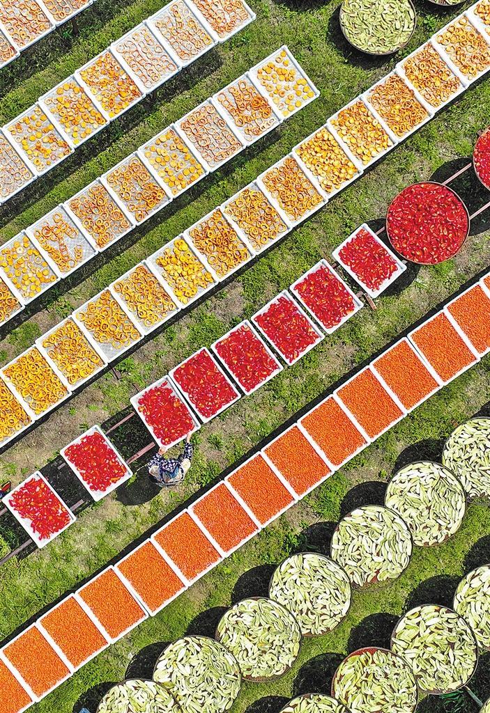 八月二十六日,江西省宜春市铜鼓县温泉镇禄田村村民在院落晾晒南瓜、辣椒、苦瓜等农作物。