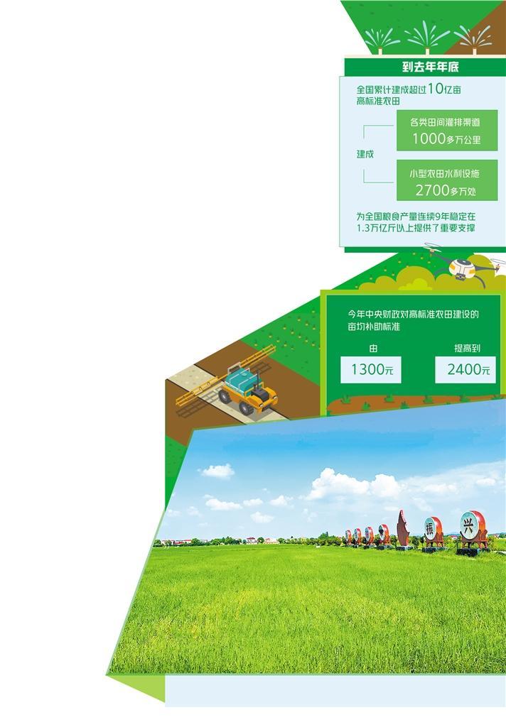 高标准农田建设事关国家粮食安全,也关系到农民群众切身利益,既是民生工程,也是民心工程。农业农村部副部长张兴旺介绍,截至去年年底,全国累计建成超过10亿亩高标准农田,建成各类田间灌排渠道1000多万公里、小型农田水利设施2700多万处,农田抗灾减灾能力明显提升,实现了大灾少减产、小灾能稳产、无灾多增产,为全国粮食产量连续9年稳定在1.3万亿斤以上提供了重要支撑。
