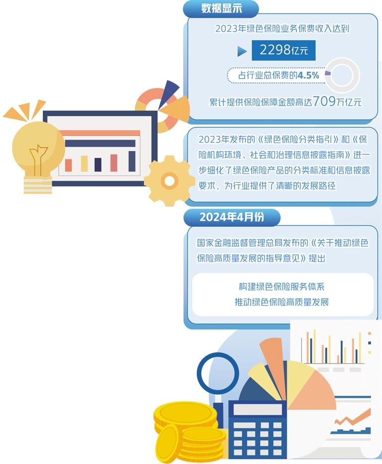 随着“双碳”目标的逐步推进,保险业作为金融服务的重要组成部分,正发挥其在绿色经济转型中的独特优势。无论是政策导向还是市场实践,保险行业通过标准制定、产品创新、服务扩展等多维度措施支持绿色发展。数据显示,2023年绿色保险业务保费收入达到2298亿元,占行业总保费的4.5%;累计提供保险保障金额高达709万亿元。