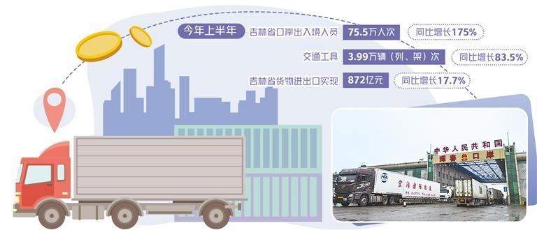 吉林出入境边防检查总站边防检查处处长朱超峰告诉记者,今年以来,该总站按照上级部门有关要求,全力服务和保障吉林省对外开放,推出全面优化商品车出口验放模式、服务企业日暨便捷吉林行等6项服务措施,采取加开通道、延时闭关等方式,有力提升了口岸通关速度和服务水平。今年上半年,吉林省口岸出入境人员75.5万人次、交通工具3.99万辆(列、架)次,同比分别增长175%、83.5%。