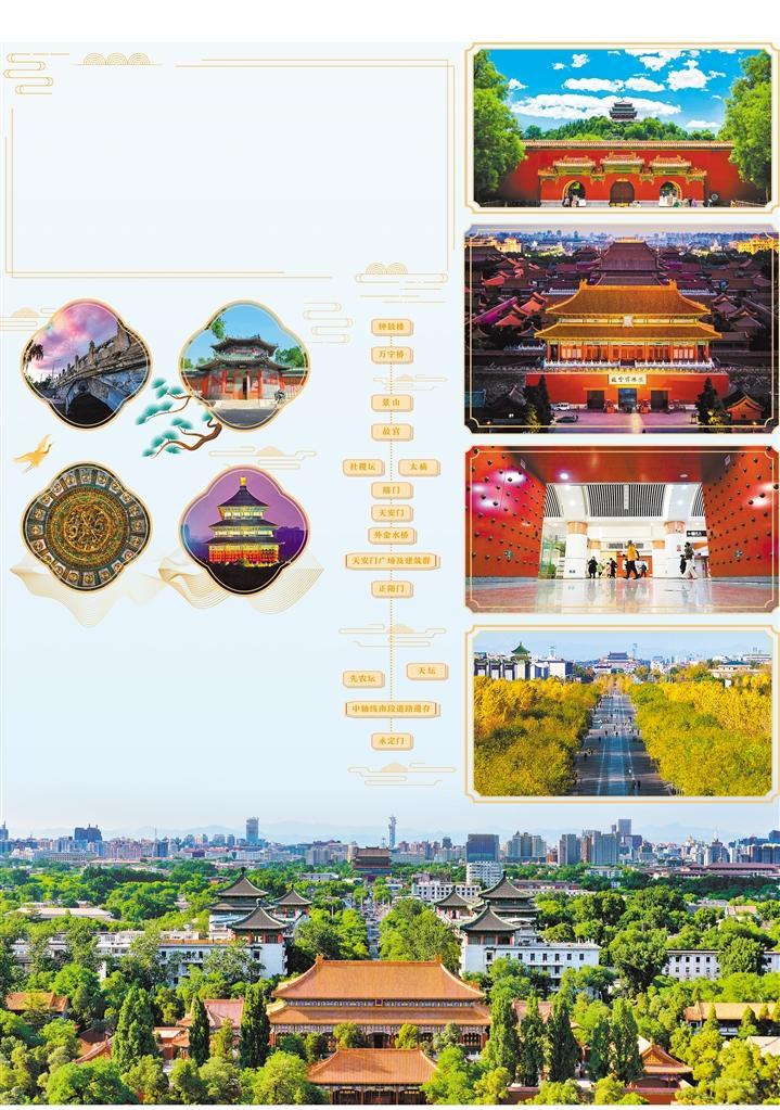 一城聚一线,一脉长相承。北京中轴线承载的是一个古今交融的大国首都绵延不绝的历史文脉。通过考古发掘、文物腾退保护利用、文物修缮,这个长达7.8公里的巨大建筑群和城市空间组合体的历史画卷更加真实、立体——北起钟鼓楼,向南经过万宁桥、景山、故宫、端门、天安门、外金水桥、天安门广场及建筑群、正阳门、中轴线南段道路遗存,至南端永定门;太庙和社稷坛、天坛和先农坛东西对称布局于两侧。