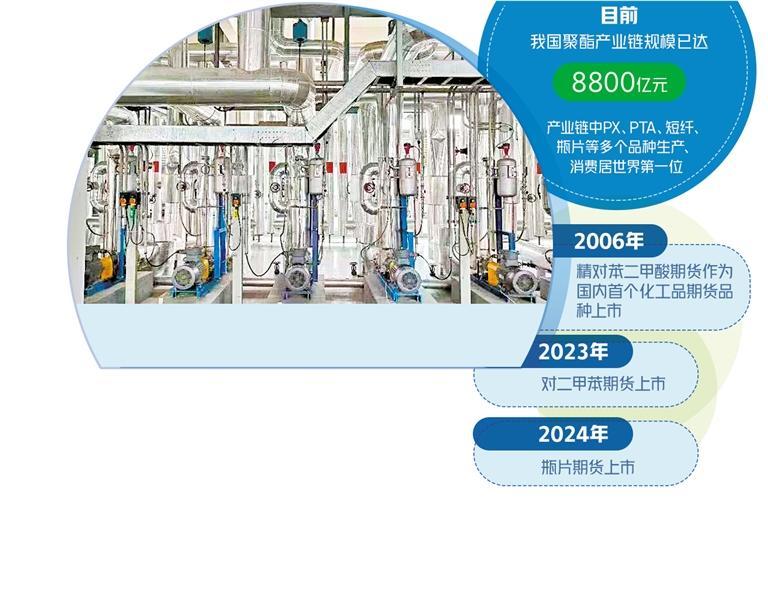 近年来,原油等大宗商品价格波动剧烈,聚酯产业链企业面临原料价格大幅波动以及有效需求不足的生产经营压力。为更好服务实体经济,郑商所持续打造“聚酯产业期货板块”:2006年,PTA期货作为国内首个化工品期货品种上市;2020年,短纤期货上市;2023年,PX期货上市;2024年,瓶片期货上市。目前,聚酯产业期货板块已成为品种涵盖多、市场规模大、产业链完善、功能发挥良好的金融避险工具,为产业链织就了一张比较完善的风险管理网。