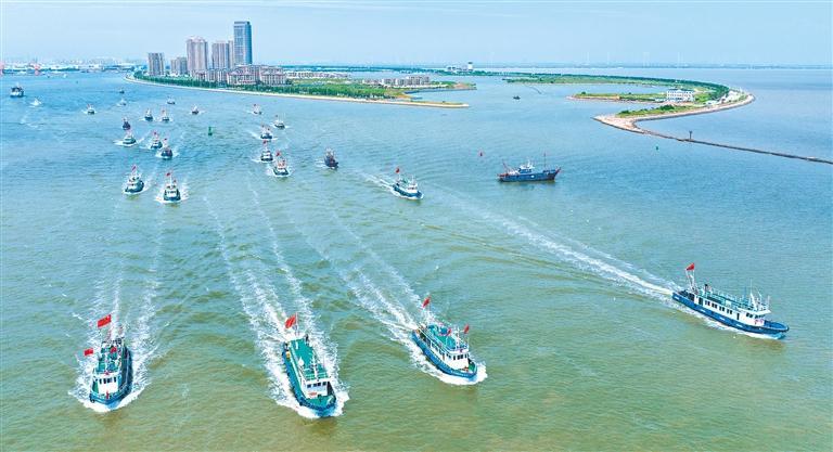 9月1日,在天津滨海新区中心渔港,渔船开启海上秋季捕捞作业(无人机照片)。当日12时,为期4个月的黄渤海伏季休渔期结束,所涉渔区迎来“开海”,各渔港码头渔船出海开展捕捞作业。杜鹏辉摄(新华社发)